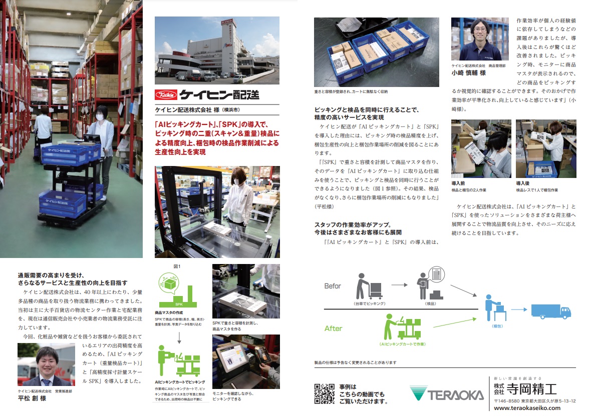 Keihin Distribution Co., Ltd. has been involved in logistics operations for over 40 years, handling mostly small-quantity, high-variety products. The company was initially involved primarily in distribution center operations and home delivery services for major department stores, and now focuses on offering logistics services to mail-order companies and retailers. To improve the accuracy of shipments for their customers selling cosmetics and general merchandise they introduced picking carts with built-in weigh scales (AI Picking Carts) and dimensioning weigh scales (SPK).