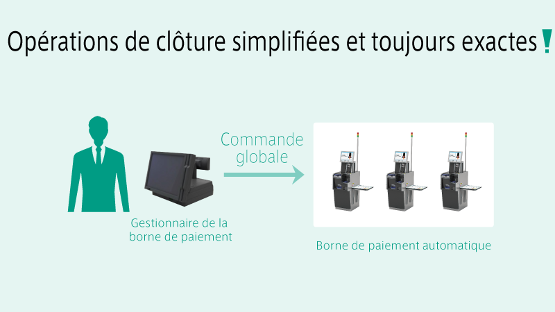 Les procédures de fermeture, qui auparavant étaient nécessaires pour chaque borne de paiement, peuvent à présent être effectuées toutes en une seule commande à partir du gestionnaire du poste de paiement. Comme tous les calculs et la collecte d'espèces sont effectués en même temps, le temps de travail est réduit avec un minimum d'erreurs humaines.