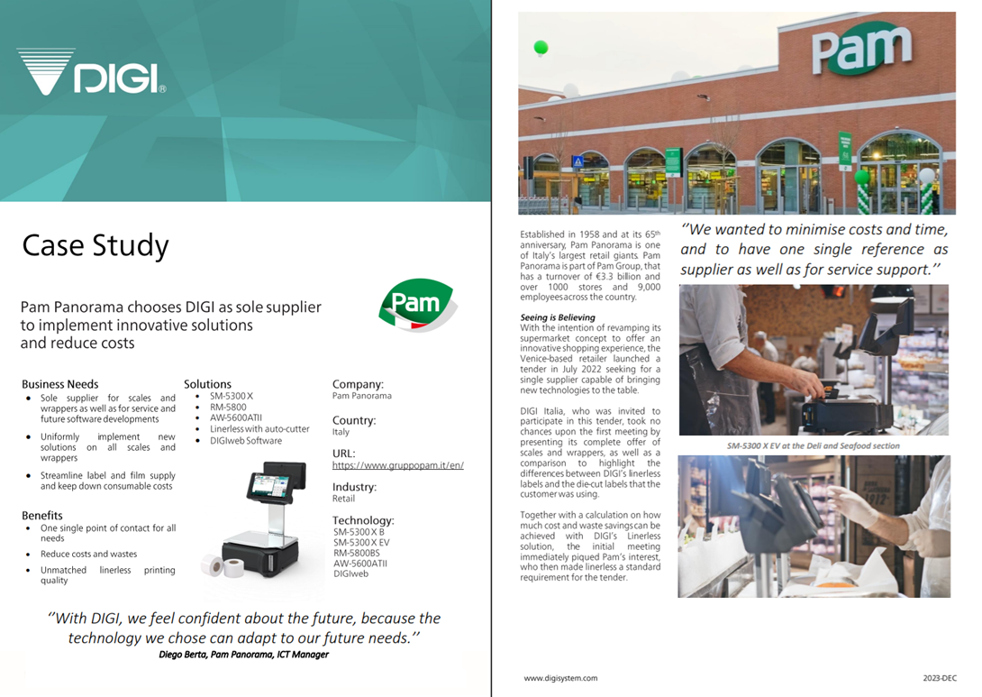 Despite fierce competition from other linerless suppliers, DIGI Italia still emerged as the top choice for Pam Panorama thanks to DIGI’s deep knowledge in linerless technology since introducing the solution industry-wide back in 2010 and the success with many other Italian retailers through the years. DIGI was also the only supplier who could offer both scales and wrappers, as well as an encompassing offer for service and future developments.