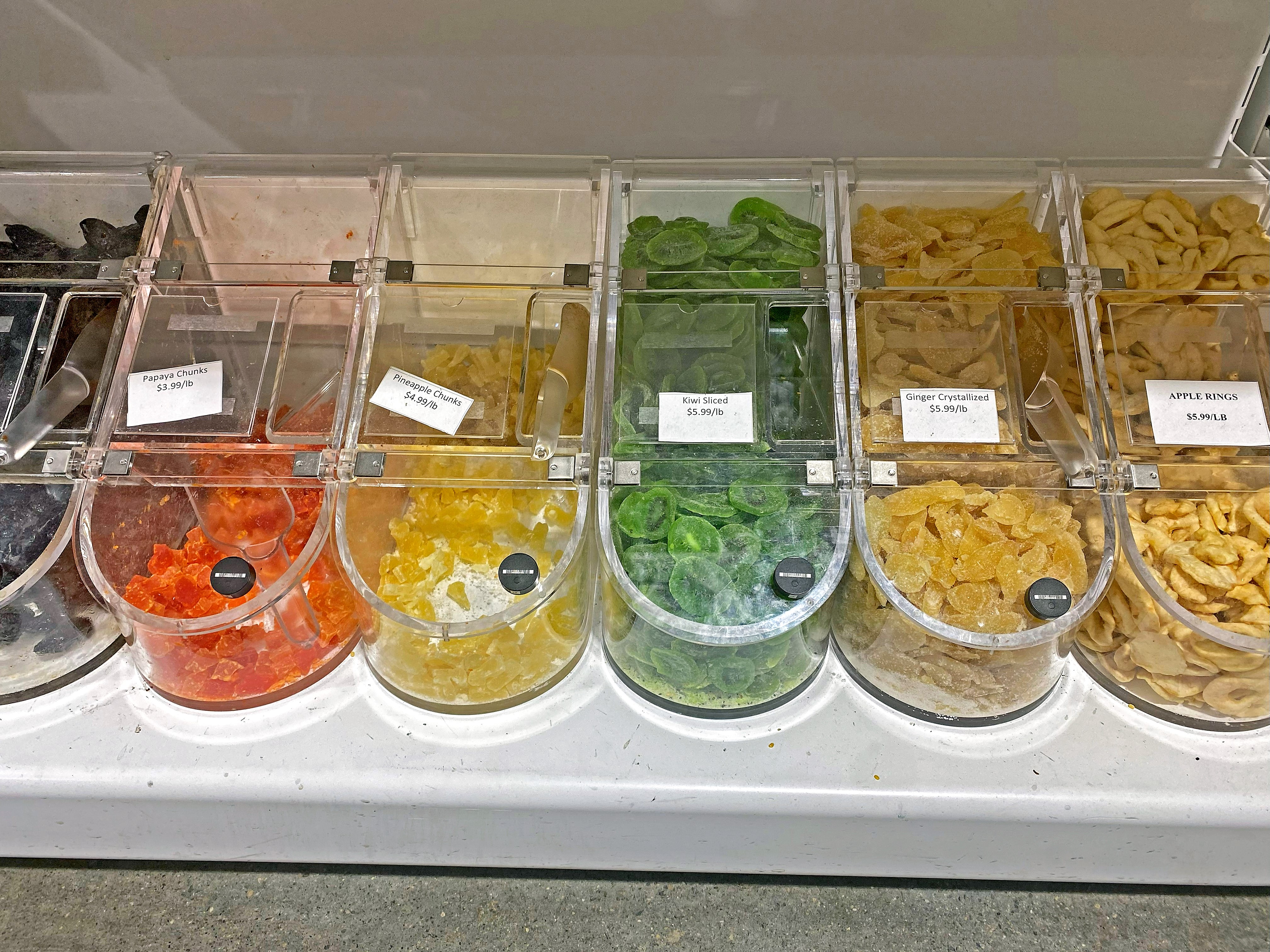 With the installation of DIGI’s self-service scale, customers dispense their own items into a bag or reusable container. The scale placed next to the 48 containers automatically picks up the item being dispensed.