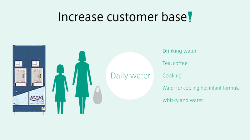 Pure water dispensed into specially provided plastic bottles can be used as safe drinking water. Because it is soft water, it is well-suited for cooking. Customers of all ages can use pure water in a wide variety of ways, such as brewing tea and coffee, watering whisky and other drinks, and cooling hot infant formula, so providing pure water as a continuous service is a sure way to increase the frequency of store visits.