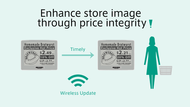 Digital display assures timely and accurate updates, enhancing customer shopping experience through price integrity. Wireless updates also bring convenience and flexibility for tag deployment, especially in bigger store layouts. The ESL solution can be operated as a full system on its own or integrated through the SM-5000 series PC scales.