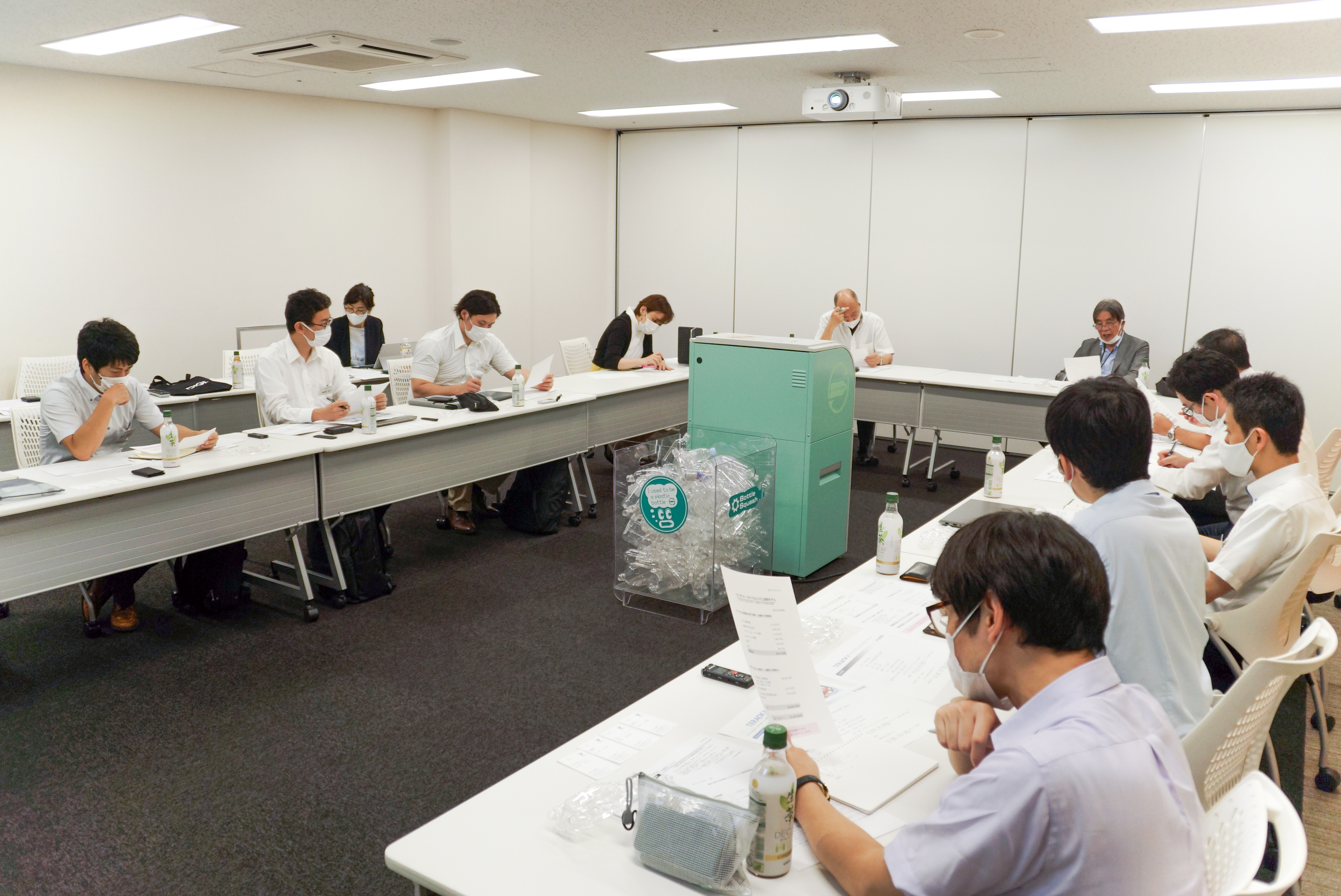 The Industry-Academia Collaboration Initiative Nonprofit Organization (IACI) (Chairman: Ken Senoh) visited Teraoka Seiko’s Osaki Showroom on Tuesday, September 15, 2020, where they inspected the Bottle Squash volume-reducing PET bottle reverse vending machine, one of Teraoka Seiko’s environment-related products, and then exchanged views on our recycling-related equipment business model and on IP management.