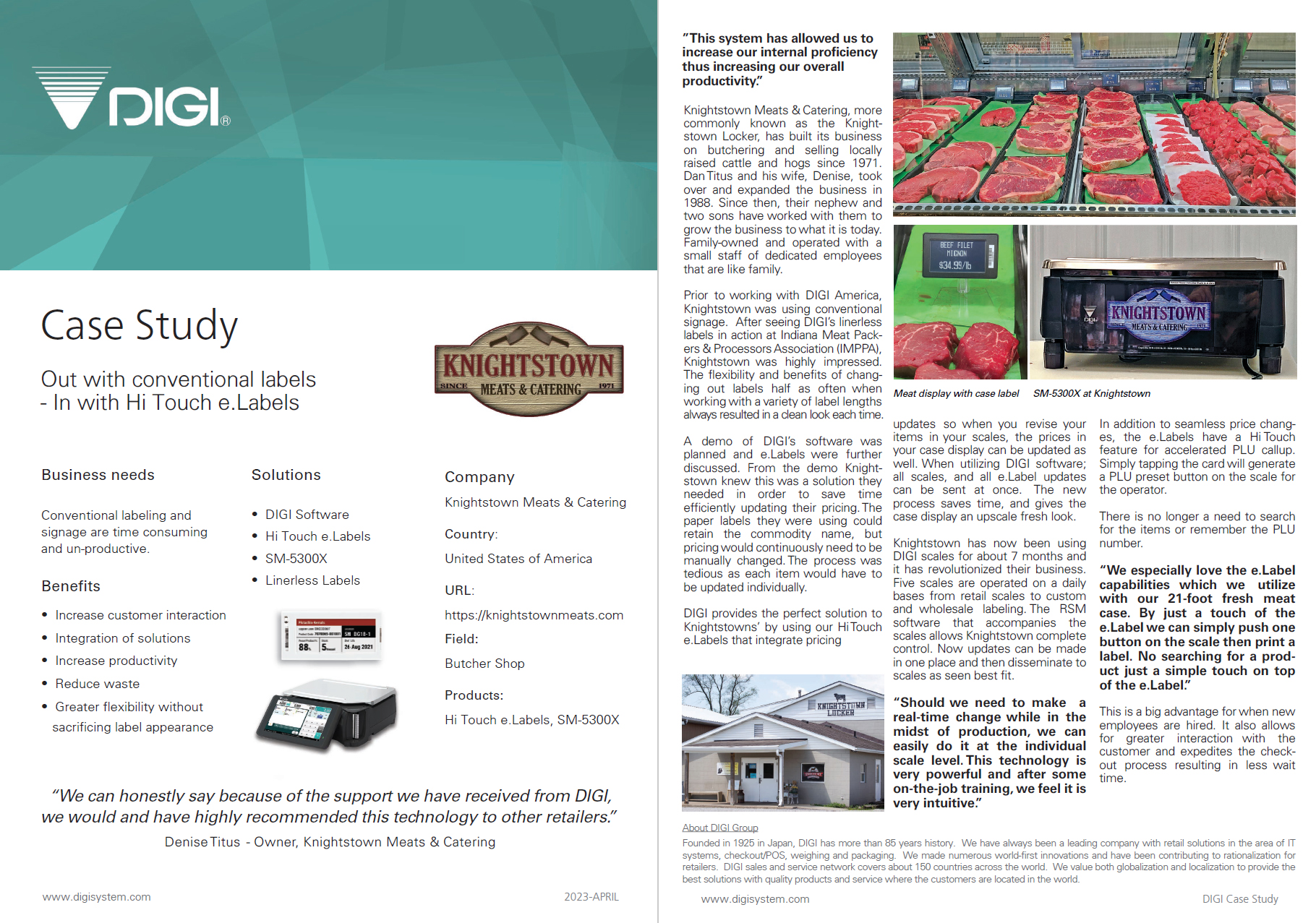 "DIGI provides the perfect solution to Knightstowns’ by using our Hi Touch e.Labels that integrate pricing updates so when you revise your items in your scales, the prices in your case display can be updated as well. When utilizing DIGI software; all scales, and all e.Label updates can be sent at once. The new process saves time, and gives the case display an upscale fresh look.